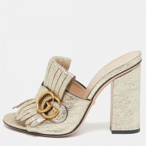 Gucci Silver Crinkled Leather GG Marmont Fringed Mules Size 37