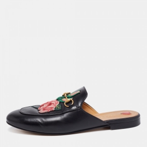 Gucci Black Leather Tiger Embroidered Princetown Horsebit Flat Mules Size 39.5