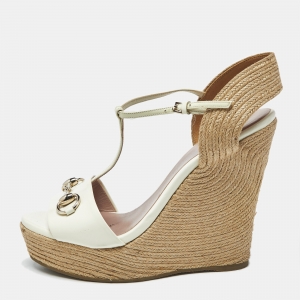 Gucci Cream Patent Leather Horsebit Wedge Espadrille Sandals Size 39.5