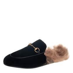 Gucci Black Velvet Fur Lined Princetown Mules Size 39