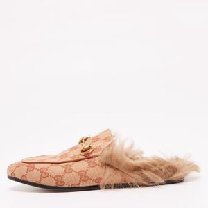 Gucci Beige/Brown GG Canvas And Fur Lined Princetown Flat Mule Size 36