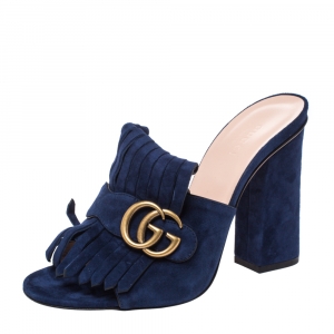 Gucci Gold Foil Leather Marmont Kiltie GG Fringe Mules Size 36.5
