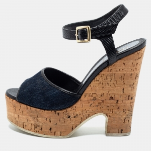Fendi Black Lizard Embossed Leather and Patent Cork Wedge Platform Ankle Strap Sandals Size 39.5