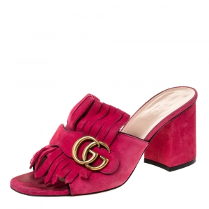Gucci Pink Suede Leather GG Marmont Fringe Detail Open Toe Sandals Size 37