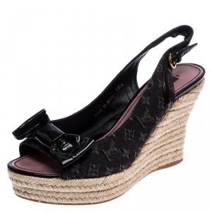 Louis Vuitton Black Denim Monogram and Patent Leather Bow Espadrille Wedge Slingback Sandals Size 37.5
