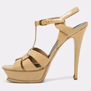 Saint Laurent Beige Patent Leather Tribute Platform Sandals Size 37.5