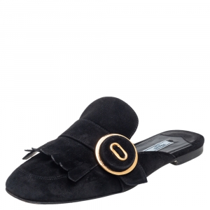 Prada Navy Blue Suede Fringe Details Flat Mules Size 40