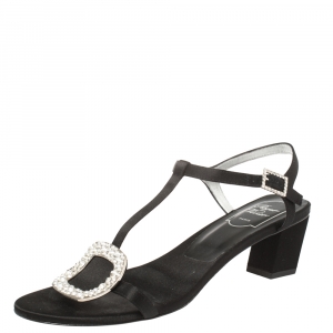 Roger Vivier Black Satin Chips Crystal Embellished Ankle Strap Sandals Size 39