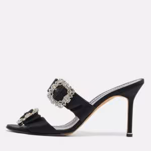 Manolo Blahnik Black Satin Crystal Embellished Slide Sandals Size 40