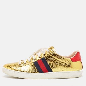 Gucci Gold Python Embossed Leather and Leather Floral Embroidered Ace Low Top Sneakers Size 37