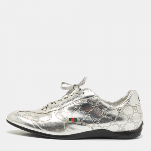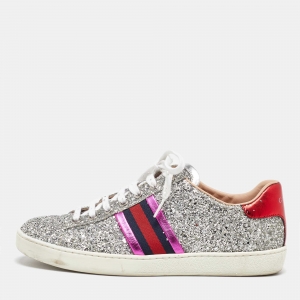 Gucci Metallic Silver Glitter Web Detail Studded Low Top Sneakers Size 39