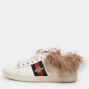 Gucci White Leather Fur Lined Bee Embroidered Web Ace Low Top Sneakers Size 37.5