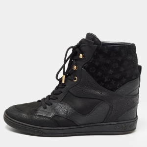 Louis Vuitton Black Leather and Monogram Suede Wedge High Top Sneakers Size 38