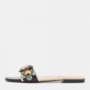 Fendi Cream Patent Leather Flower Embellished Slide Sandals Size 39