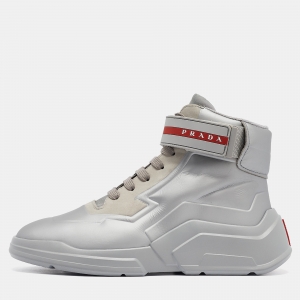 Prada Sport Silver Leather Lace Up High Top Sneakers Size 37
