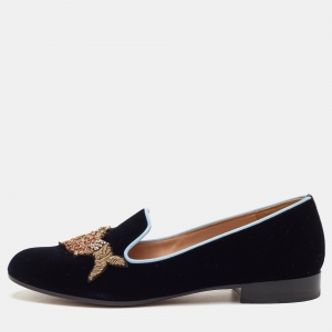 Gianvito Rossi x Mary Katrantzou Size 37 Navy Blue Velvet Fish Embroidered Slip On Loafers
